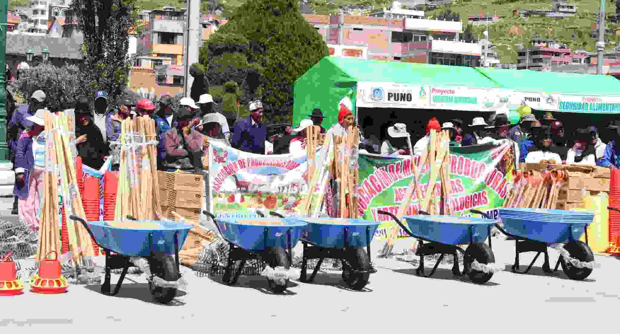 Con masiva participación el día de hoy, el Proyecto Seguridad Alimentaria de la Gerencia Regional de Desarrollo Agrario del Gobierno Regional de Puno realizó la entrega simbólica de materiales para la construcción de biohuertos y módulos de crianza tecnificada de animales menores (cuyes y gallinas) en 31 organizaciones de la zona sur de la región. Con un presupuesto de más de S/ 1’500 000, que están distribuidos en materiales como; calaminas galvanizadas, rastrillos, palas, picos, mallas, comederos tipo tolva, gazaperas, carretillas y plástico azul, materiales esenciales para impulsar la seguridad alimentaria en las familias beneficiarias.